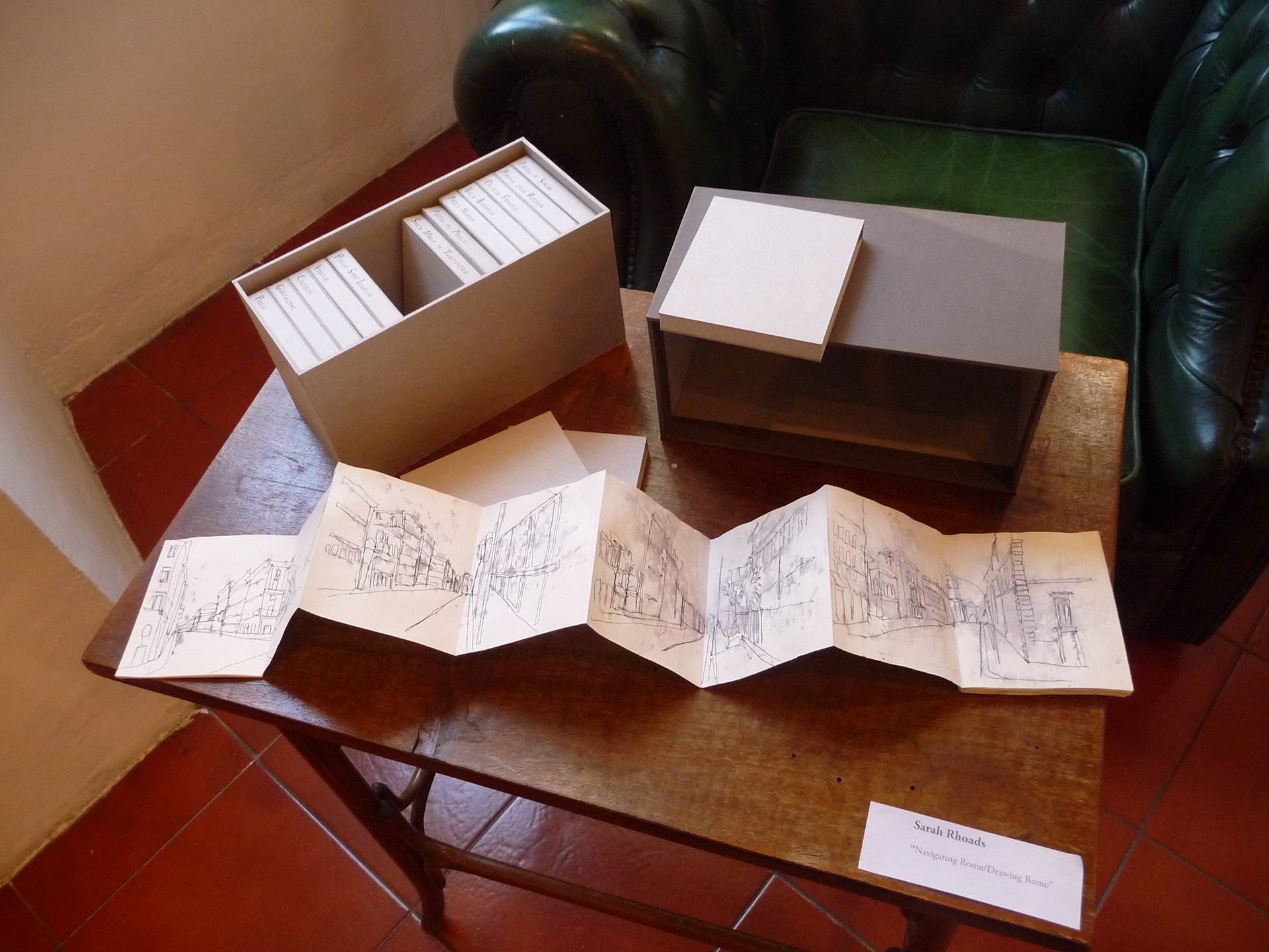 After completing a series of singular drawings documenting the streets of Rome, I realized that a more narrative format would be more effective, so I created these books. Each book is accordion in format, about 25 pages long, and each shows a sort of frame-by-frame experience of walking down a street in Rome. Each is about reaching a particular monument or destination in the city. There are fifteen books in total, all drawn on site, in the streets, many in the rain.